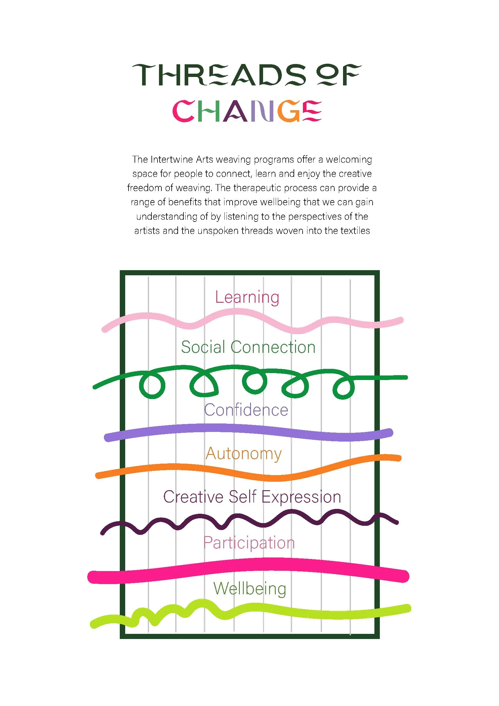 Through the process of weaving with groups of people who may otherwise be marginalised or excluded from mainstream arts resources or services, we are able to interconnect people socially through the power of craft. Examining the social power of creativity and craft: (David Gauntlett, D. 2011)